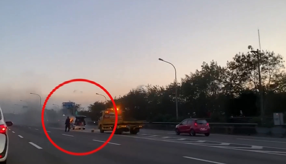 消防六大隊春社分隊員劉忠豫:「其它車輛鳴按喇叭警示後,駕駛隨即靠邊發現,右前方引擎是在冒煙起火,他就下車等待救援。」