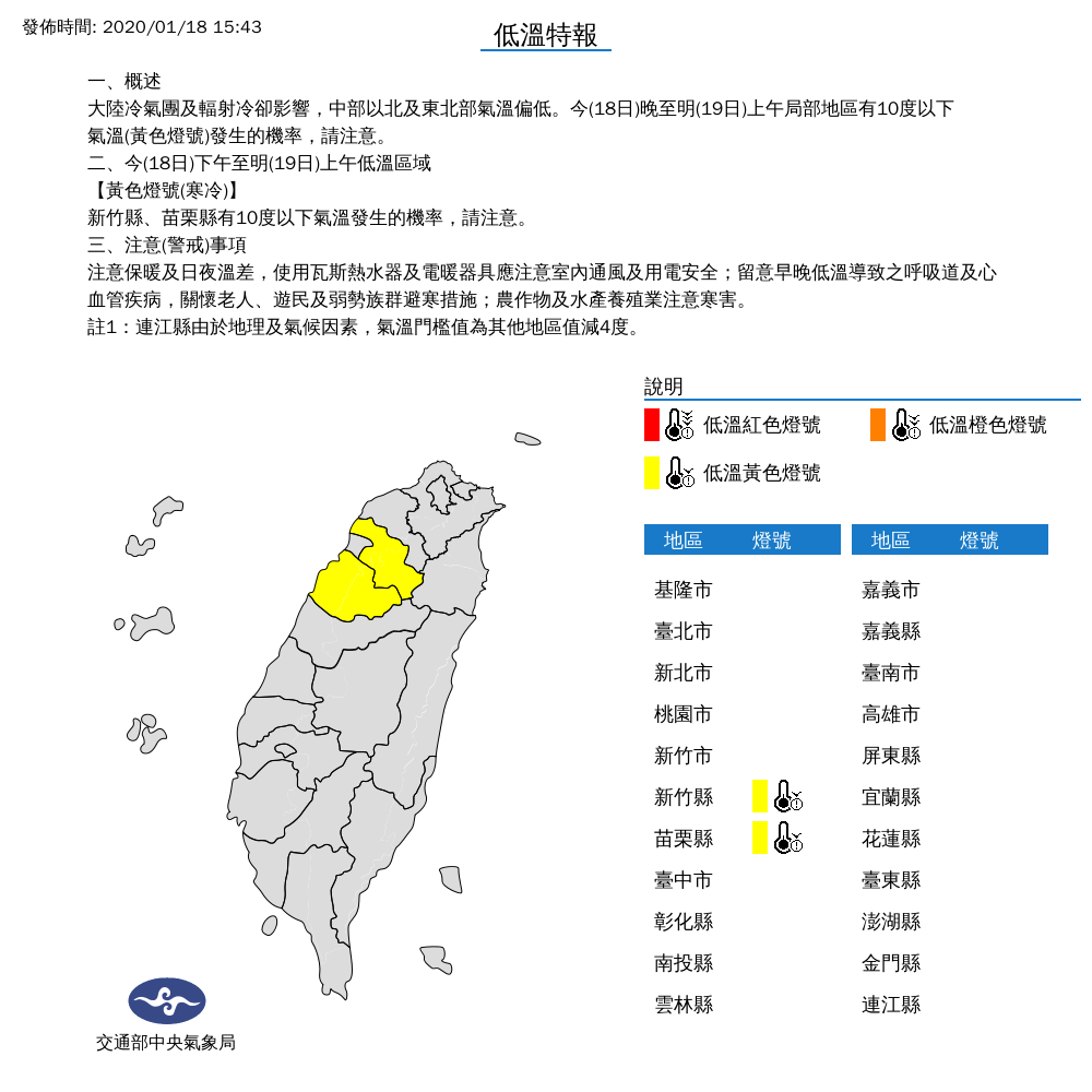 ▼中央氣象局發布低溫特報,新竹縣、苗栗縣恐有10度低溫發生。(圖/中央氣象局)