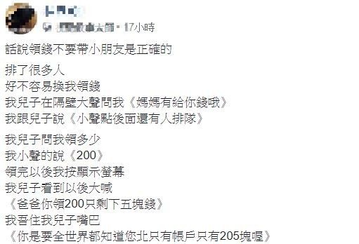 近日有名爸爸18日在臉書社團《爆怨公社》發文,分享他和兒子去領錢的經過,當天排隊的人很多,過了一會好不容易終於輪到他領錢時,只見兒子在隔壁大聲地問道,「媽媽有給你錢哦?」原PO當下隨即尷尬的壓低聲音,要他講話小聲一點,「還有人在排隊。」沒想到兒子還是繼續窮追不捨,追問要領多少錢。原PO只好小聲的再次回答,說要領200塊。