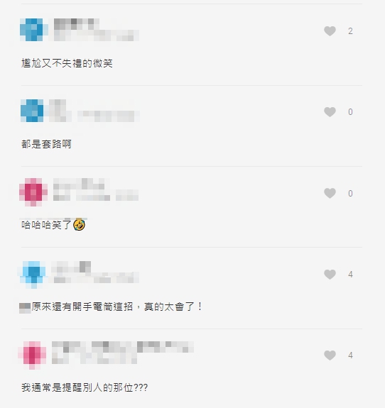文章一出,引起網友熱烈討論,紛紛笑說「蠻尷尬的,可是好好笑哈哈」、「笑死,我也被一個大媽提醒過」,也有人覺得原PO應該要撩回去,「妳要回:『我的心也被你點亮了』,就這麼錯過攻擊機會,多看點撩妹語錄吧,反正男女適用」、「要回『就讓它亮著吧,我想好好看看你』」,還有人搞笑說出天菜的心聲:「對面的女孩子拿手電筒刺我整路,還一直偷看我,擺明故意的,我到底哪裡惹到她...」文章吸引超過9千人按讚。