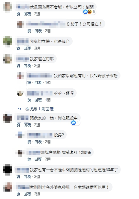 還有不少人陷入回憶,「小時候家裡也有一台,冬天時烘衣服還可以當暖爐,好懷念」、「我家也有一台,77年朋友送的嫁妝,到現在還在使用,沒有修理過,真的很好用」、「我家也有一台快30年了,民國97年水災的時候淹過水,到現在還在用呢」、「冬天好幫手,只要有烘衣服,我就會把腳放在中間」、「我家用了至少20年,還很猛...最近因為旋鈕故障,想說萬一出門在外沒有注意一直烘乾的話很容易危險...」還有人偷爆料,「我家以前也有一台,我爸還會把私房錢藏在裡面」。