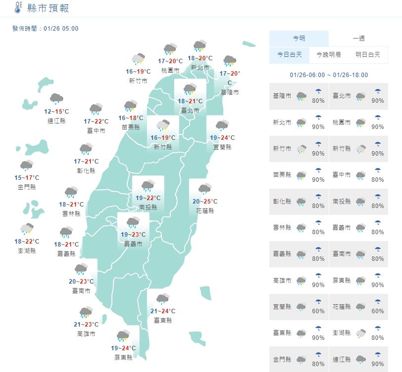 氣象局指出,今天(26日)鋒面通過影響,各地轉為溼冷的天氣型態,西半部地區及基隆北海岸有較明顯的陣性降雨,有出現局部雷雨及較大雨勢的機率,東半部地區也有短暫陣雨。