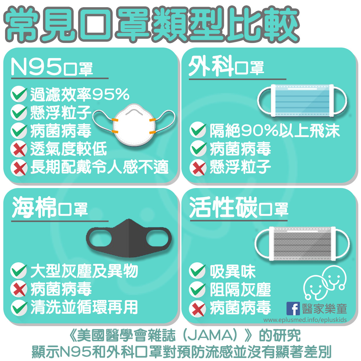 另外,憂心疫情擴散,有民眾開始搶口罩,甚至認為N95防病毒功效最強。對此,由香港專科醫師及各領域專家,所組成的臉書粉專《醫家樂童》指出,依據《美國醫學會雜誌(JAMA)》研究,表示「N95口罩和外科口罩,對於預防流感並無顯著差別。」並針對常見的4種口罩款式進行比較,發現其中有2款口罩無法防病毒病菌。