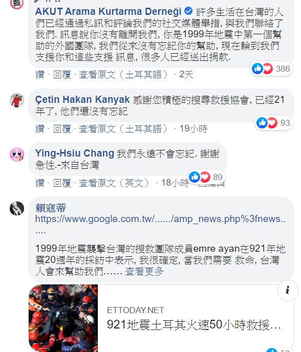 在臉書的上述發文下方留言中,有土耳其民眾詢問為何單獨感謝台灣。