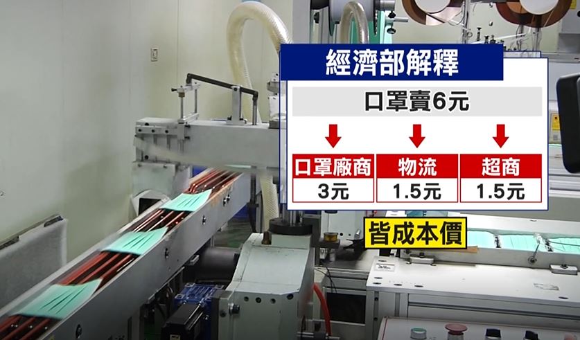 被問到政府徵收的價格,口罩業者表示賣給中央的一般醫療口罩一片2.5塊,外科口罩是3塊,經濟部官員也解釋,口罩賣6元,其中3元是給口罩廠商,另外3元分別給物流和超商各半,幾乎都是成本價。