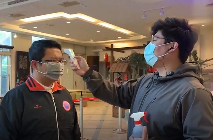 飯店大廳工作人員量測住客體溫,沒有超過37度都能夠入住,南投住宿業者防疫作戰,第一線人員落實檢測。