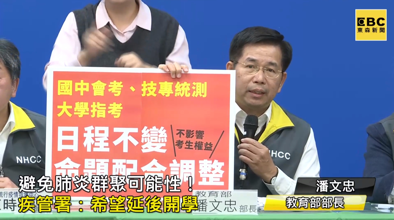 教育部長潘文忠宣布,高中等級以下學校將延長寒假、縮短暑假,2月15日不補課,延長至2月25日開學,7月14日休業。依照中央流行疫情指揮中心今日決議,因應武漢肺炎疫情,學校若按原定2月11日開學,恐有群聚感染的疑慮,為維護師生健康,決定將108學年度第2學期延後2週於2月25日開學,基於1學年上課天數為200天之規定,因此,該學期休業式延至7月14日辦理,109學年度暑假為7月15日至8月29日。至於國中會考、技專統測、大學指考,各項入學考試日程維持不變,命題範圍將配合縮減調整,不影響學生考試權益。
