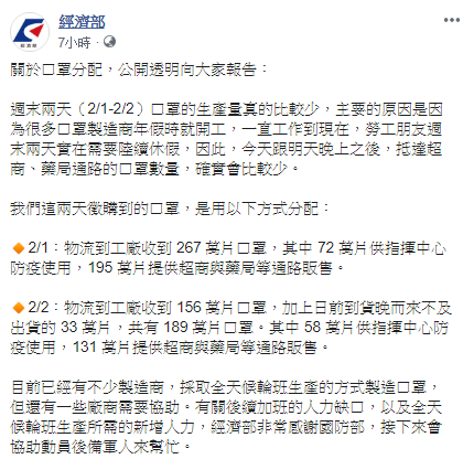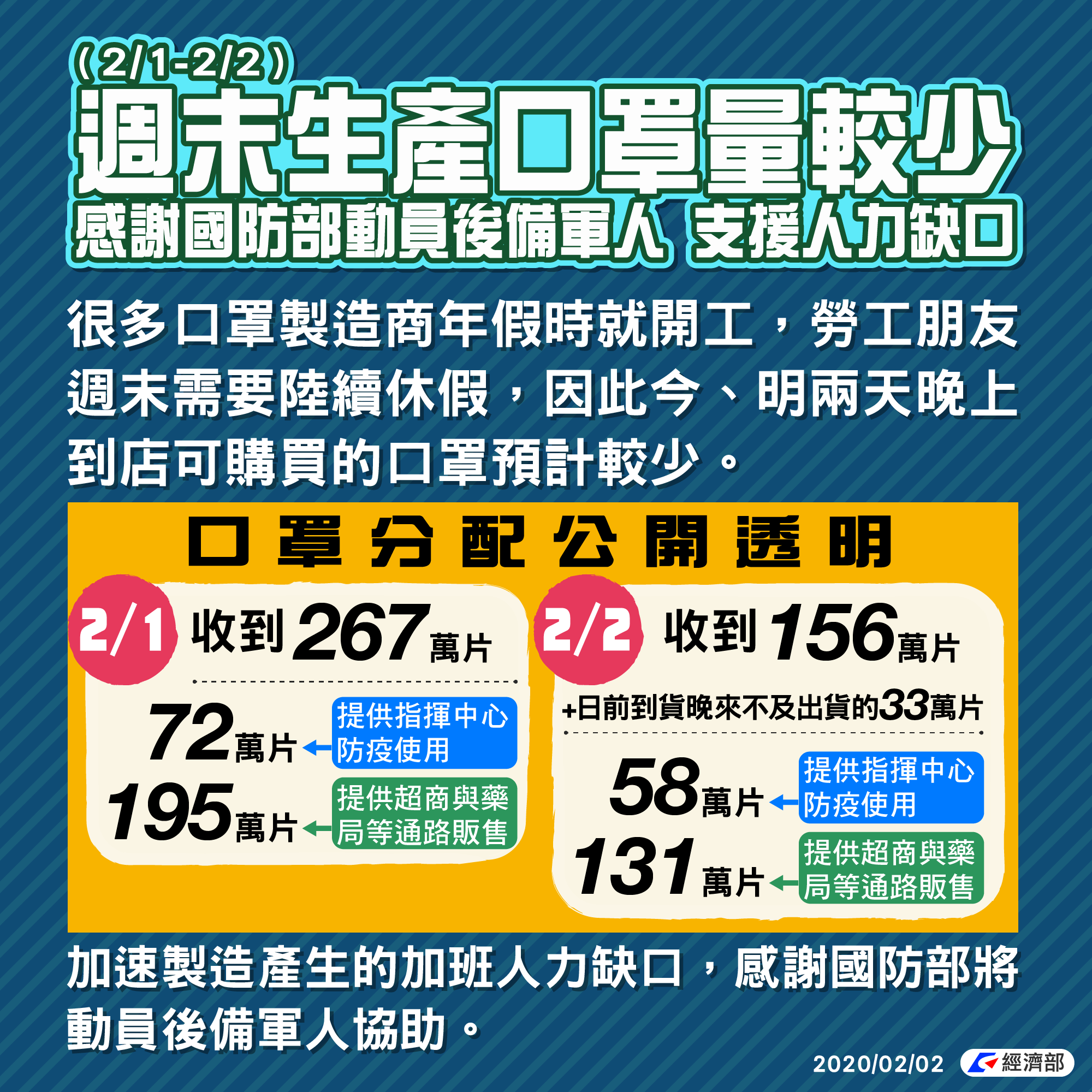 經濟部晚間於臉書發文表示,2月1日、2日週末兩天的口罩生產量真的比較少,主要原因是很多口罩製造商年假時就開工,一直工作到現在,勞工週末兩天實在需要陸續休假,因此今天跟明天晚上之後,抵達超商、藥局通路的口罩數量,確實會比較少。