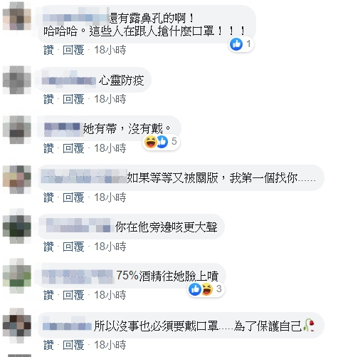 這張照片曝光後,引來不少網友一陣罵聲,網友紛紛留言表示,「下巴感冒」、「快去通告列車長吧,這種時期真的人心惶惶」、「趕快跟她說,保護全車的人就靠你了」、「換你咳給她聽,她就會戴起來了」、「這是心理上的防疫」、「這節車廂頗危險」、「活動式生化武器」、「為了想活久一點,我會認倒楣去站別車廂」。