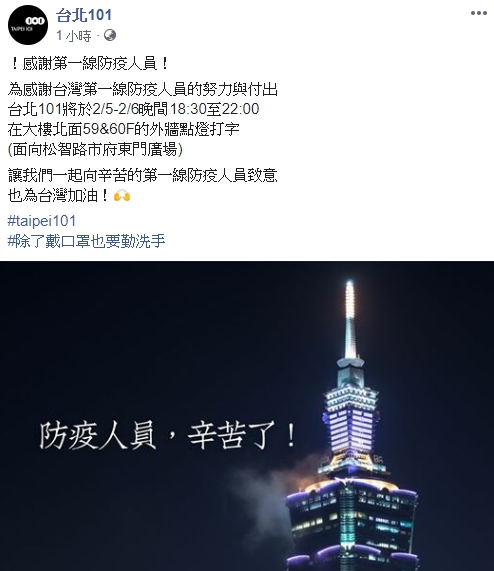 武漢肺炎疫情持續蔓延,台灣第一線防疫人員不眠不休為人民健康把關。台北101表示,今、明兩天晚上,將在大樓外牆點燈,對防疫人員表達謝意。