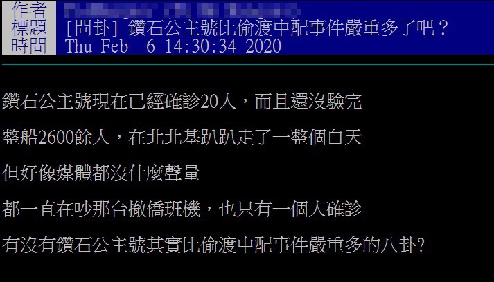 鑽石公主號郵輪曾載有一名感染武漢肺炎的香港旅客,目前正停留在橫濱港外海進行檢疫。該艘遊輪一共搭載2694名旅客,1月31日停靠基隆港時,遊客們全數下船至北北基自由行一天才上船,其間到過九份、故宮和台北101等著名景點。對此,一名網友6日在PTT以「鑽石公主號比偷渡中配事件嚴重多了吧?」發問,原PO表示,「整船2600餘人,在北北基趴趴走了一整個白天,但好像媒體都沒什麼聲量」,重點全放在台商包機返台事件上,讓他質疑,「有沒有鑽石公主號其實比偷渡中配事件嚴重多的八卦?」