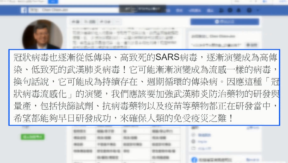 ▼陳建仁認為新冠病毒,可能漸漸演變成類似流感的病毒。(圖/翻攝自陳建仁臉書)