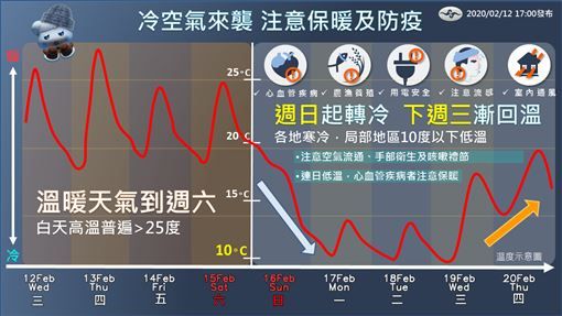 氣象局指出,周日將迎來一波強烈冷空氣,估計影響到下周三(19日),最冷時間點則會落在下周二(18日)的清晨,到時台南以北、東北部最低溫約9到12度,花東、高屏則約12到15度,空曠地區溫度還會在降,直到周三(19日)後各地才會回溫。
