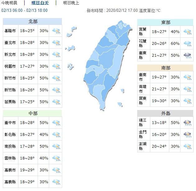 氣象局今天指出,周四(13日)雖然中午前各地高溫仍有25度以上,但預計中午過後,中部以北就會開始下雨,僅接著中南部、宜花東等等,傍晚過後全台轉為有雨天氣,明顯雨勢時間點會落在周四晚上至周五(14日)白天。氣象局提醒,明後兩天的降雨熱區會在西半部、以及東半部地區,有機率發生局部大雨以及短暫雷陣雨,至於花東地區則會有局部短暫陣雨,雨勢一直到周六,全台才會趨緩,呈現北部時情時雨,中南部多雲,僅東半部友局部短暫陣雨。