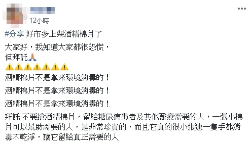 一名女網友在臉書社團「Costco好市多 商品經驗老實說」中發文,「好市多上架酒精棉片了」,不過接下來卻拜託大家別搶購。原PO表示,「我知道大家都很恐慌,但拜託,酒精棉片不是拿來環境消毒的!」她指出,應把它們留給糖尿病患者及其他醫療需要的人,對這些真正有需要的人來說相當珍貴,「而且它真的很小張,連一隻手都消毒不乾淨,讓他留給真正需要的人。」