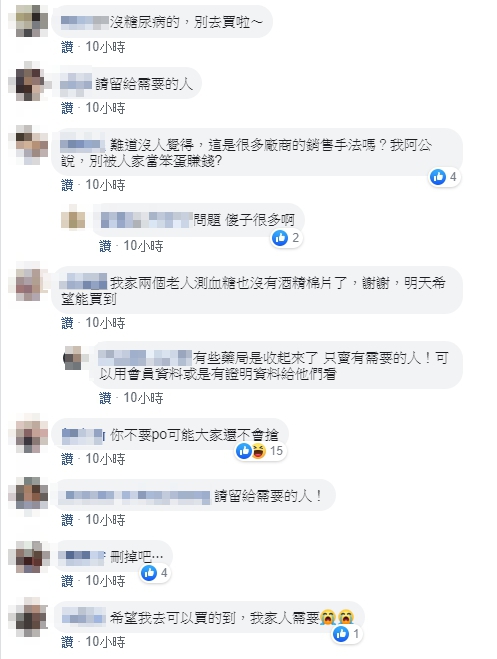 貼文一出,立刻湧入萬人按讚,網友們紛紛相挺,「留給需要的人拜託!」、「正常人多洗手就好,別跟需要的人搶這個」、「沒糖尿病的,別去買啦~」,也有許多家中親人有需要的網友也留言呼籲,「我父親需要…打針都要用,希望買得到」、「請留給需要的人…我母親有糖尿病很需要,好不容易買到一盒」。