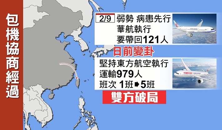 可是隔天大陸官方突然改變協議,堅持由東方航空執行任務,而且運輸人員,增加到979人,並且從一班增加到五班,最後宣告破局。