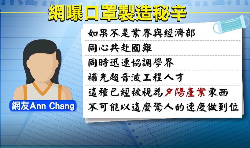 她更說到,這次經濟部2個禮拜一口氣開出60條生產線,台灣人真的要跪下來哭了,謝謝再謝謝,如果不是業界與經濟部同心共赴國難,同時迅速協調學界補充超音波工程人才,這種已經被視為夕陽產業的東西,不可能以這麼驚人的速度到位。