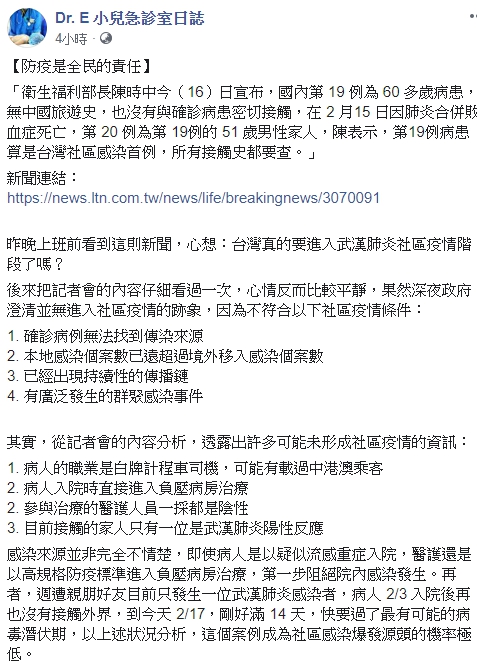 中山醫學大學附設醫院兒童急診科主任謝宗學在臉書《Dr. E 小兒急診室日誌》發文,表示看到台灣出現死亡首例,不禁擔心「台灣真的要進入武漢肺炎社區疫情階段了嗎?」不過他事後把記者會的內容仔細看過一次,心情反而比較平靜了,果然深夜官方就澄清,並無進入社區疫情的跡象。