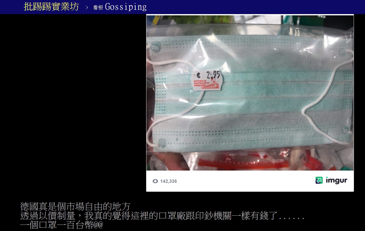 該名網友在《PTT八卦版》發文寫道,「德國真是個市場自由的地方,透過以價制量,我真的覺得這裡的口罩廠跟印鈔機關一樣有錢了…一個口罩100元台幣」。從圖片中可見,口罩外的塑膠包裝貼有「€2.95」標籤,若以現今匯率(1:33.07)換算新台幣,約為97.6元。相較於台灣目前一片5元的售價,讓原PO非常震驚。