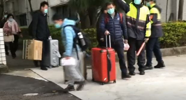 開心說掰掰拖著行李,武漢包機返台民眾,結束整整14天隔離,終於可以回家,檢疫所天還沒亮 ,就開始廣播。
