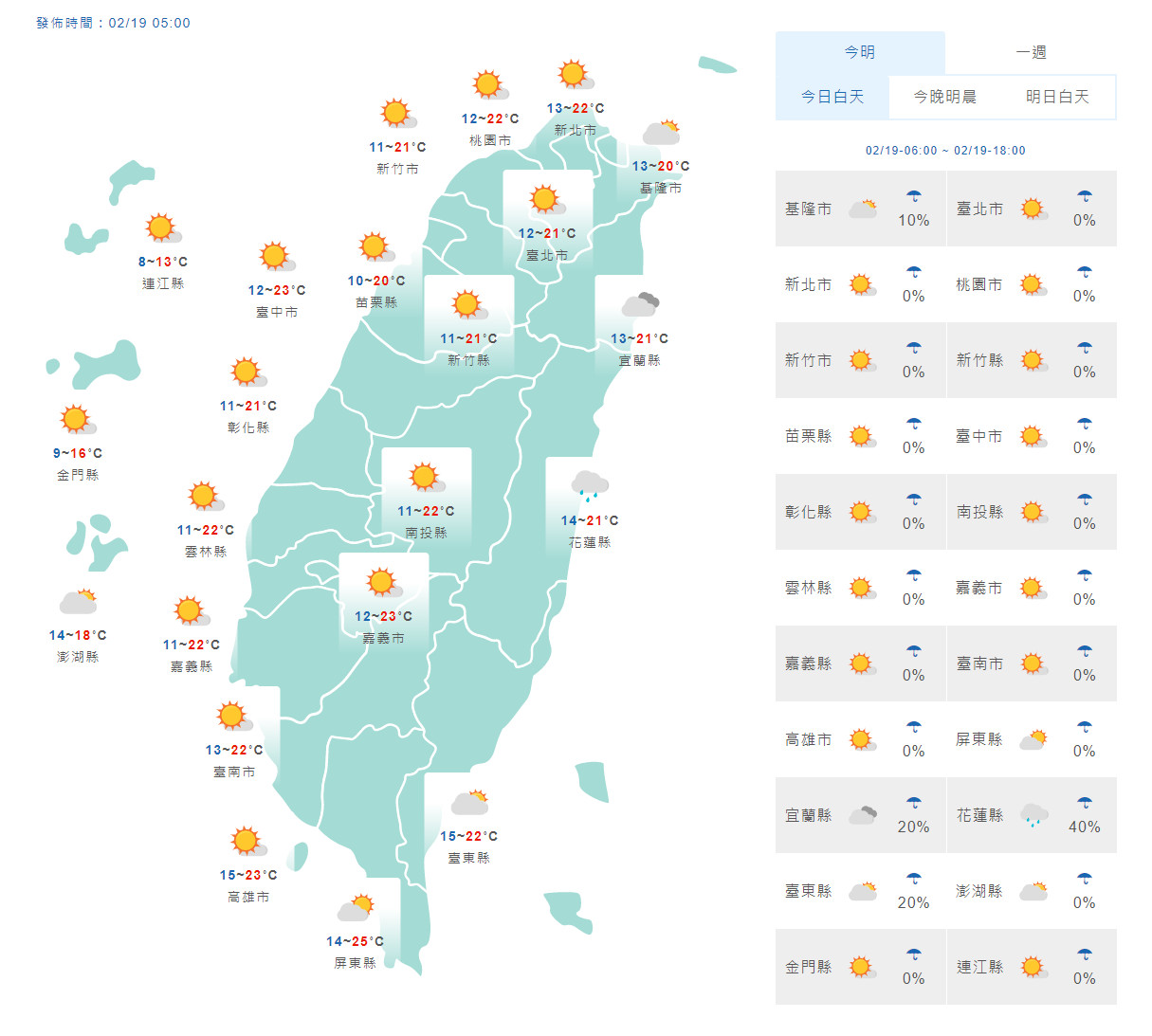 逐漸回溫!今(19)晨受到輻射冷卻影響,全台最低溫出現在新竹縣峨眉的6.6度,白天起寒流減弱,氣溫開始回升,未來一周各地大致為多雲到晴,僅東半部有零星雨,預計南部周六高溫可到29、30度,不過早晚受到輻射冷卻影響,仍要留意日夜溫差。