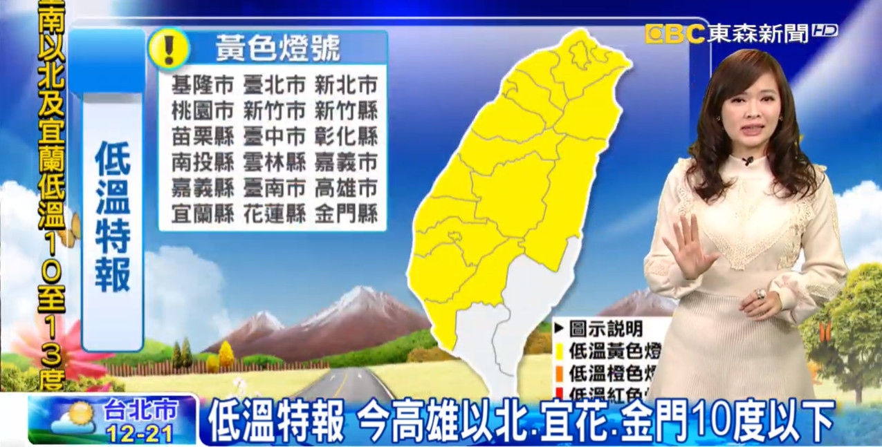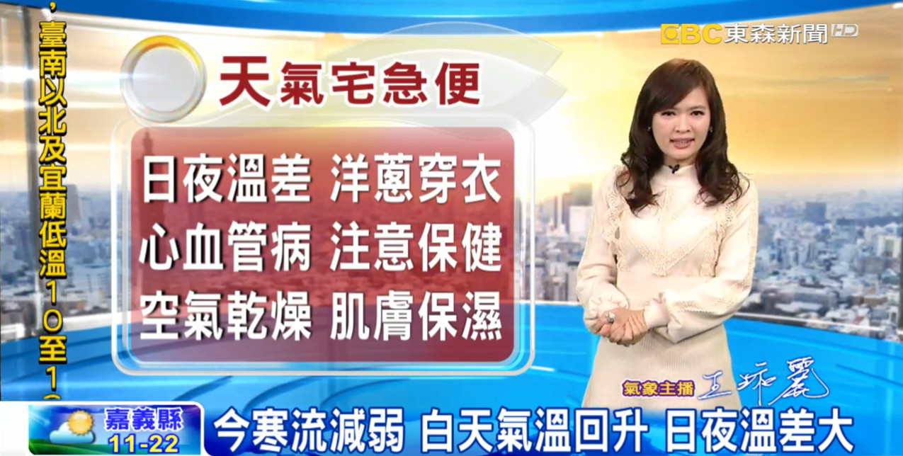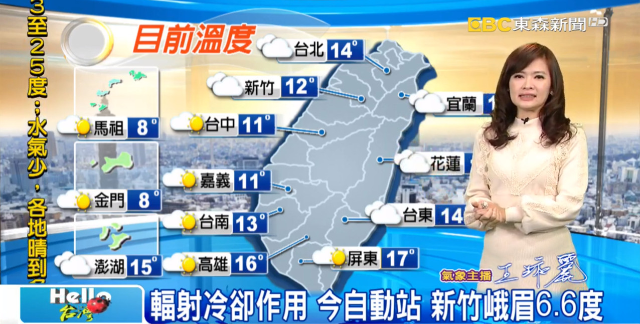 根據中央氣象局,今日清晨受冷空氣及輻射冷卻影響,各地天氣仍非常寒冷,台南以北及宜蘭低溫10至13度,高屏及花東低溫14、15度;而在高雄以北、宜蘭、花東縱谷及金門沿海空曠及近山區局部地區仍有10度以下低溫發生的機率;預測白天起寒流逐漸減弱,氣溫回升,北部及東半部高溫約21、22度,中南部高溫約23至25度;水氣明顯較少,各地大多為晴到多雲的天氣,僅東半部地區有零星短暫雨。