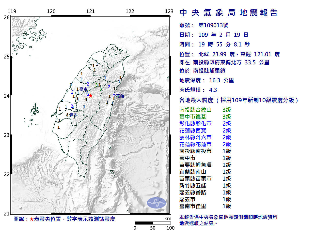 地震報告:2/19-19:55規模4.3南投縣埔里鎮深16km,投3中3彰2花2雲2苗1宜1竹1嘉1南1。