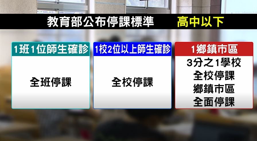 教育部公布停課標準,高中以下,1班有1位師生確診就全班停課,1校有2位以上師生確診病就全校停課,如果1鄉鎮市區有3分之1學校全校停課,該鄉鎮市區全面停課。