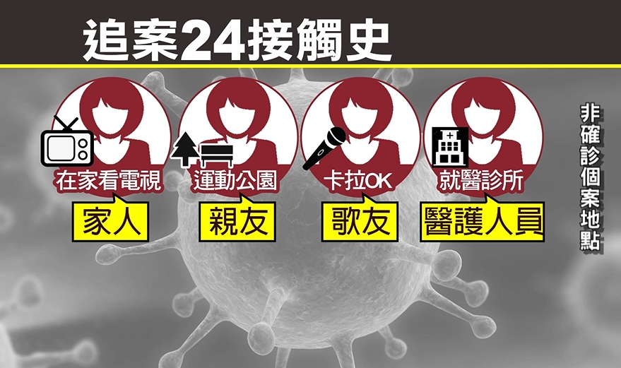 從第24例確診婦人生活習慣來推算,還有幾個地點都有危機,她在家看電視,家人是最親近的人,還有跟朋友去運動公園,或是去卡拉OK唱歌的歌友,以及有症狀後,四度就醫到過2、3間診所,甚至30日住院後,可能接觸的醫護人員總共大約360人,現在通通要進行採檢,全面檢視這名沒有旅遊史的婦人接觸史,就怕有漏網之魚。