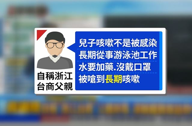 浙江台商的父親指稱,自己兒子咳嗽,並非是因為感染,而是在游泳池工作,需要加藥卻沒戴口罩,一次嗆到之後導致長時間咳嗽。