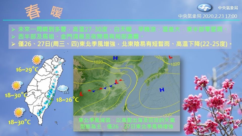 氣象局表示,至於周五至周日(27日到1日) 228連假期間,東北季風將減弱,降雨區域會縮小,僅東半部有局部短暫雨。各地氣溫也再度回升,西半部除竹苗之外,大致都有27-29度,屏東高溫上看30度。氣象局也提醒,除了周四以外,本周西半部、金門、馬祖地區要注意清晨有局部霧影響能見度。另外,今起一直到周三,東半部跟恆春半島沿海地區也要留意長浪發生。