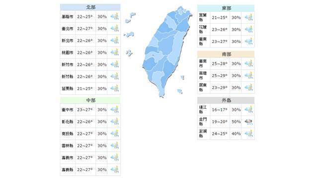 溫度方面,由於不下雨的時候陽光仍有露臉的機會,各地高溫普遍落在27至32度之間,白天可能會感覺有些