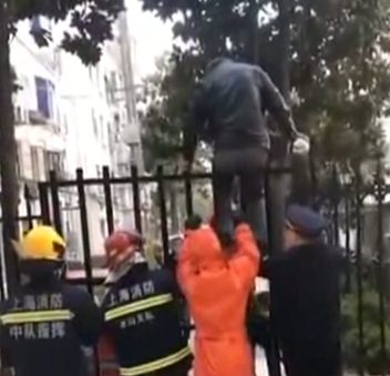 ▼老先生不戴口罩試圖翻牆卻卡在欄杆上。(圖/翻攝自今日中國微博)