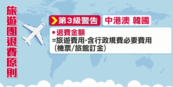 觀光局依照疫情,有明確定出退費原則,如果是第一級注意的國家,民眾退費金額,會是旅遊費用扣除行政規費,與賠償旅行社損失,第2級警示像是台灣民眾,經常去的日本,團費就算全退,還必須扣除航空公司訂金,或是當地旅館不肯退費。