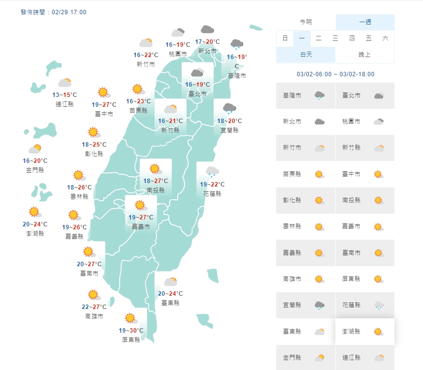 根據中央氣象局預測,明天(3月1日)由於鋒面通過及東北季風逐漸增強,天氣會有些轉變,東半部一整天仍有局部短暫陣雨,並有局部較大雨勢發生的機率,北部地區下午之後也會轉為有局部短暫陣雨,中南部地區也有些零星降雨,建議出門要攜帶雨具備用。