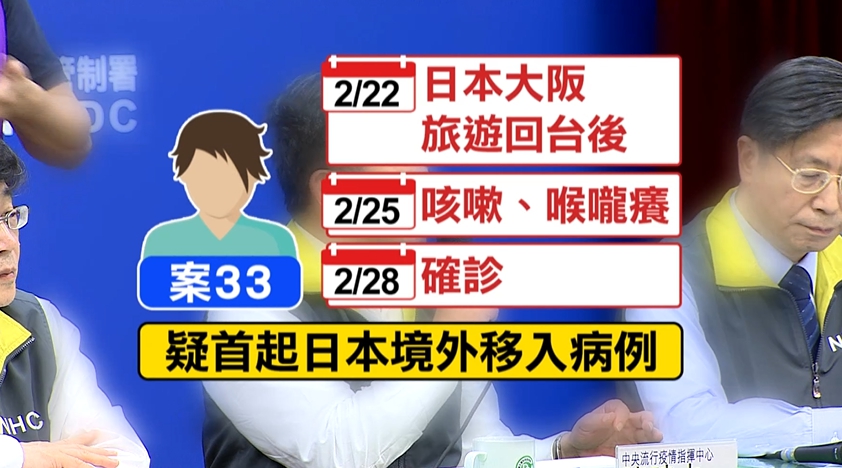 北部30多歲男子是第33例確診個案,由於他發病之前曾在日本大阪旅遊,同團旅客還有同事67人,已經有3人出現症狀,指揮中心也公布他在日本的行程,更高度懷疑他可能就是在日本染上武漢肺炎。