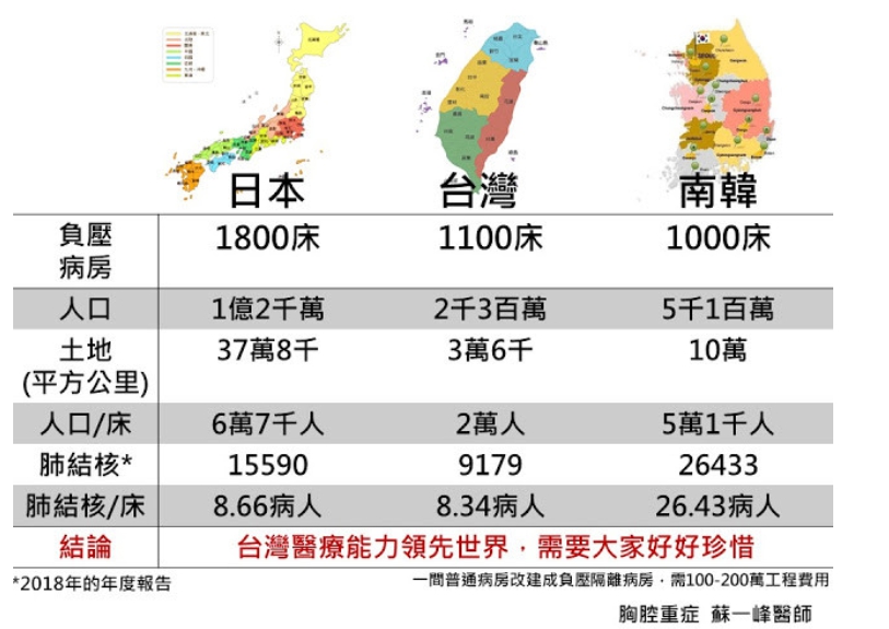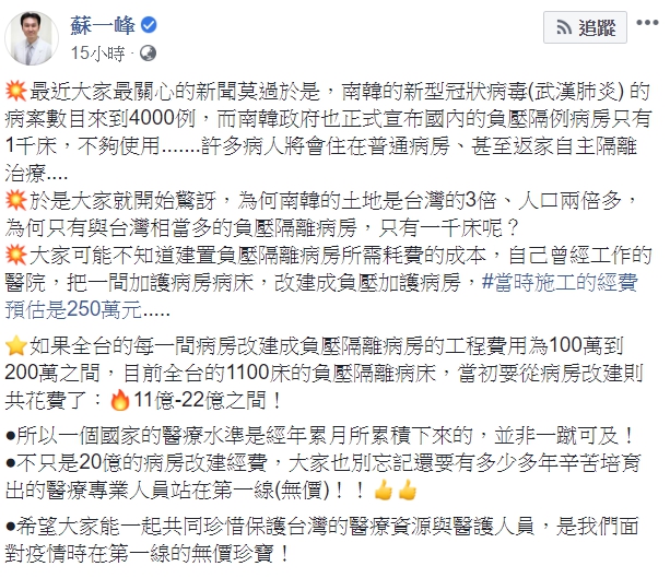 蘇一峰昨(2)日在臉書表示,近日南韓的確診病例已攀升至4000多例,但南韓政府宣布國內的負壓隔例病房只有1000床,收容能力不足,使許多病人得住在普通病房,或返家進行自主隔離治療,讓不少人相當震驚,為何南韓的土地是台灣的3倍、人口兩倍多,為何只有與台灣相當多的負壓隔離病房,只有一千床呢?