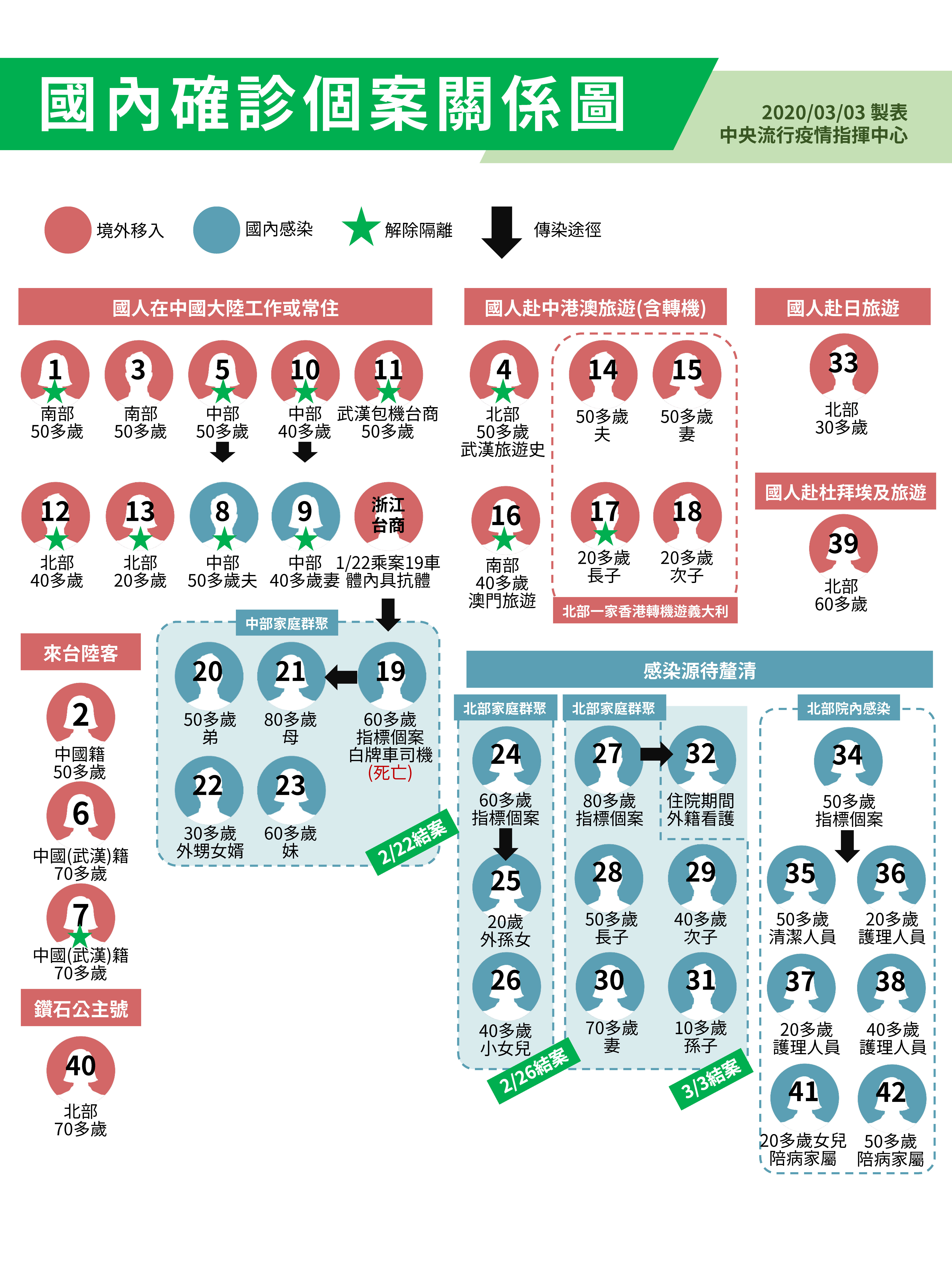 中央流行疫情指揮中心統計,昨(2)日國內新增161例嚴重特殊傳染性肺炎通報個案,目前累計通報2,450個案,含42名確診(今日新增第42例)、2,135名排除,餘隔離檢驗中(154名初驗陰性、其餘待檢驗)。確診個案中,1名死亡、12名已出院、其餘個案病況穩定,持續住院隔離中。案27相關群聚接觸者828人,共採檢183人,其中5人陽性(案28至32)、其餘皆為陰性;針對案33、39、40境外移入個案接觸者,持續追蹤健康情形及採檢結果;鑽石公主號19名返台國人無後送個案,持續於集中檢疫所密切觀察健康情形。