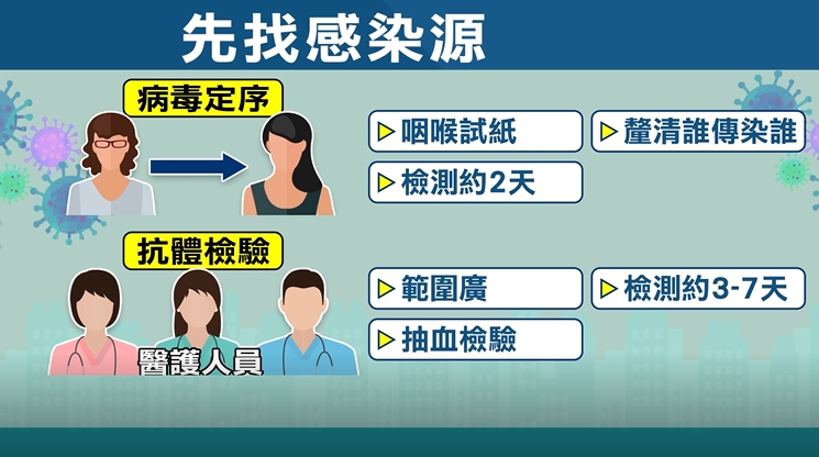 台大主任黃立民建議,除了病毒定序方法以咽喉試紙檢測大約2天,也可以採用範圍更廣的抗體檢驗,假設把整層病房的醫護人員都抽血檢驗,時間儘管需要3到7天,但至少能更全面的釐清,誰可能曾感染過武漢肺炎,進而再去調查這些人的接觸史。