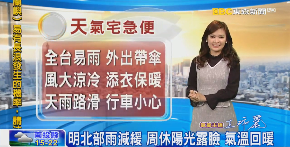 中央氣象局表示,今日清晨北台灣低溫僅13至15度,其他地區也只有16至18度,外出請多加件衣物避免著涼,北台灣一整天較涼,高溫僅17、18度,中部及花東高溫約20至22度,只有南部較舒適,高溫約23至26度;降雨方面,除了東北季風影響外,華南雲雨區亦東移帶來水氣,北台灣及花蓮有斷斷續續的降雨,中部地區也有局部短暫雨,南部地區則是多雲偶雨的天氣型態。