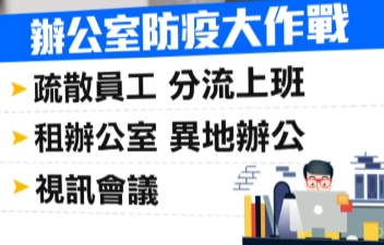 公司裡開空調,同事跟同事之間的距離近,為了避免把人都集中在同一個地方,就得疏散辦公室員工,分流上班外,在其他地方租辦公室,異地辦公或是進行視訊會議,就不怕發生確診案例整間公司員工被傳染,也能有效防止疫情擴散。