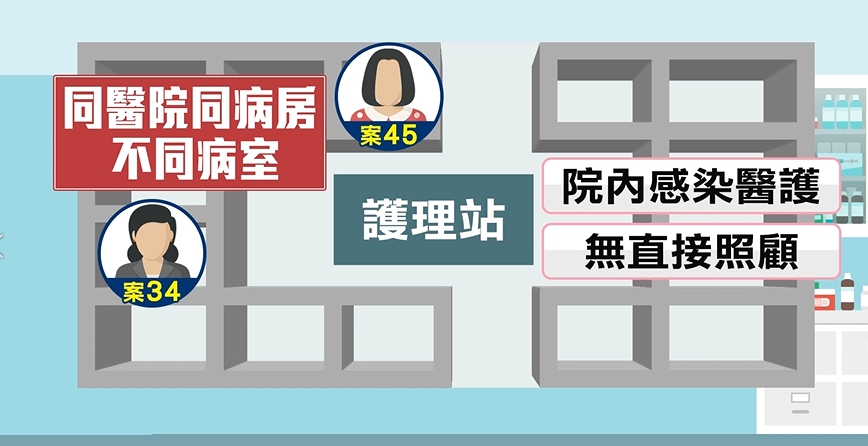 攤開平面圖來看,第45例曾經和34例住過同醫院、同病房,但是不同病室,弔詭的是,從班表上看,先前院內感染的3名醫護人員並沒有直接照顧45例,讓情況變得更複雜。