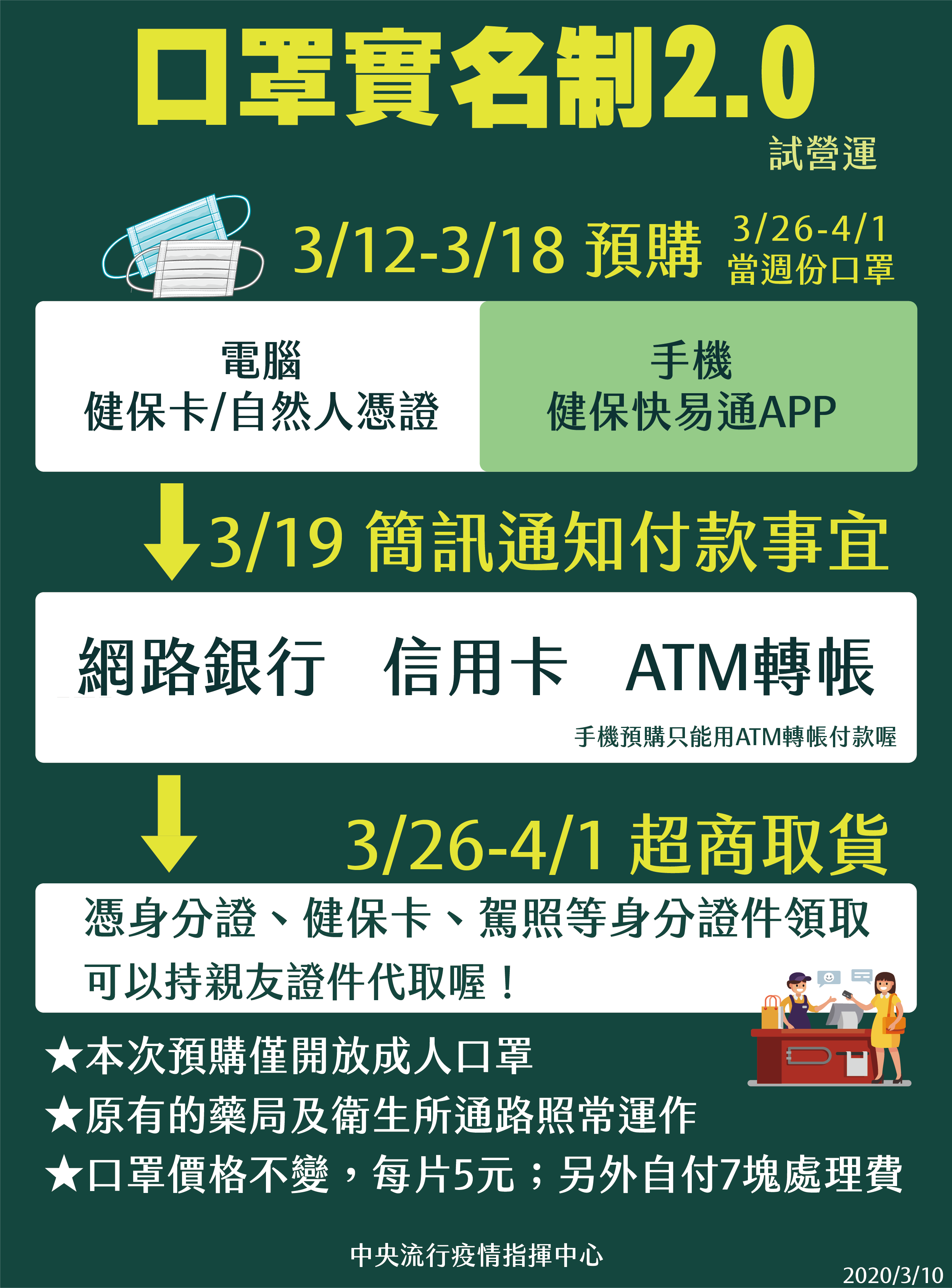中央流行疫情指揮中心今(10)日表示,「口罩實名制」實施至今已一個多月,為了改善口罩分配不均的問題,及讓沒時間排隊買口罩的上班族、學生等族群便於購買口罩,經過政府、民間業者資訊人員日以繼夜開發測試後,將於3月12日(週四)推出「口罩實名制2.0」,除了現有健保特約藥局及衛生所等實體通路外,新增線上預購通路,民眾可透過健保卡、自然人憑證登入平台,或可藉由健保快易通行動APP進行認證預購。
