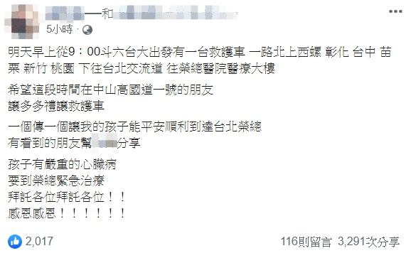 雲林有位小朋友罹患嚴重心臟病,明(12)日早上9點將從斗六搭救護車路經中山高國道一號,前往台北榮總動手術,為了讓寶貝能平安地抵達醫院,孩子的爸爸在臉書請大家幫忙,希望在該時段會經過同個路段的用路人能禮讓救護車,「拜託各位!拜託各位!感恩感恩!」