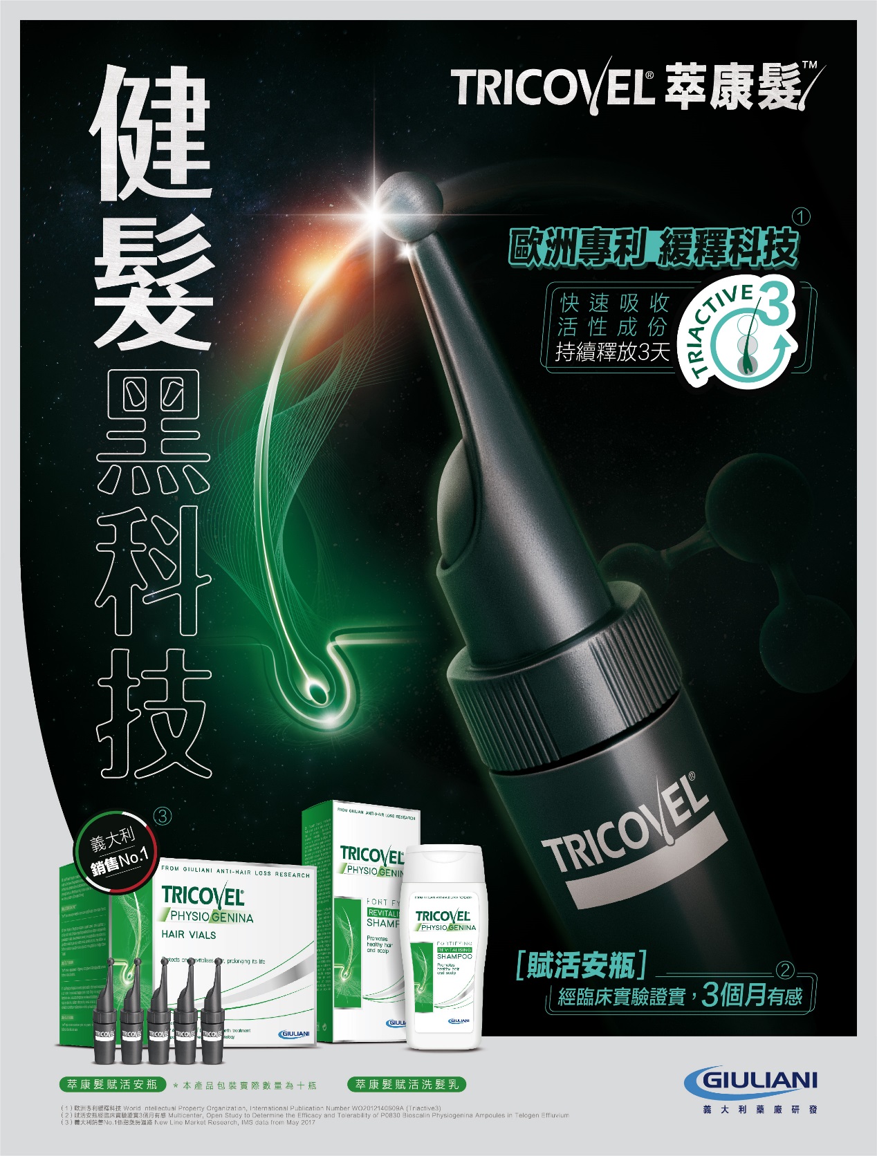 來自義大利銷售No.1的健髮黑科技-Tricovel®萃康髮TM,由Giuliani藥廠研發製造,男女適用,其賦活安瓶經臨床實證,使用3個月健髮有感,95%消費者感受「我的髮根更強健了」!