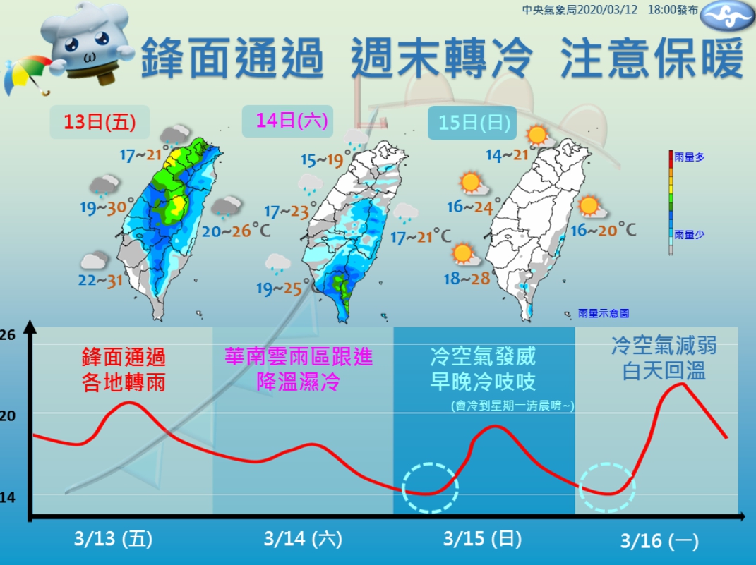 氣象局預估,週六冷空氣南下以及受華南雲雨區影響,降雨範圍較大,不過雖全台有雨但雨勢較不明顯,至於氣溫部分,因輻射冷卻效應影響,北部低溫13-14度、中部及花蓮15-16度、南部及台東17-19度,中部以北及東北部沿海空曠地區則可能出現10、11度低溫。