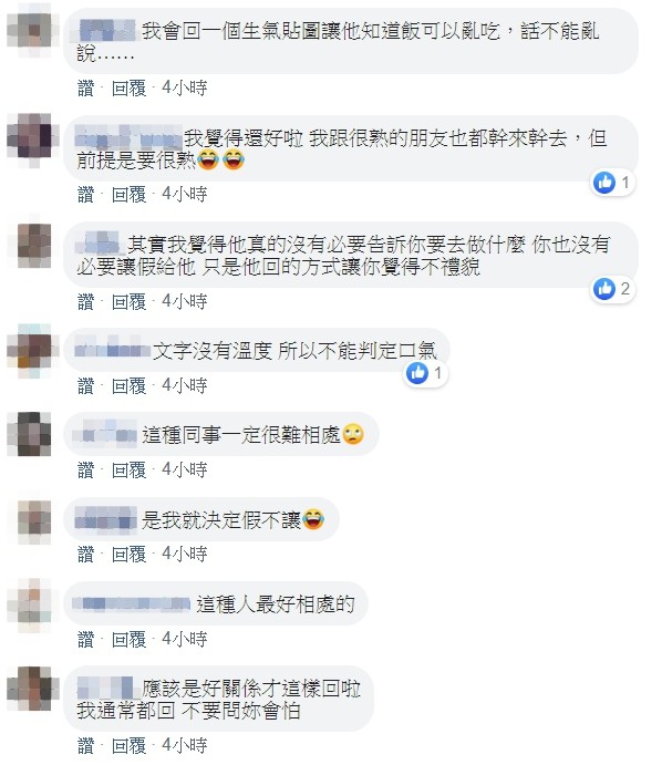 貼文發出後,不少網友也認為同事態度不佳,建議原PO下次不需要讓假,「同事好白目」、「不好笑!沒家教的態度,要是我絕對沒下次」、「很多人沒禮貌當開玩笑,少了尊重,其實我也會不高興」。