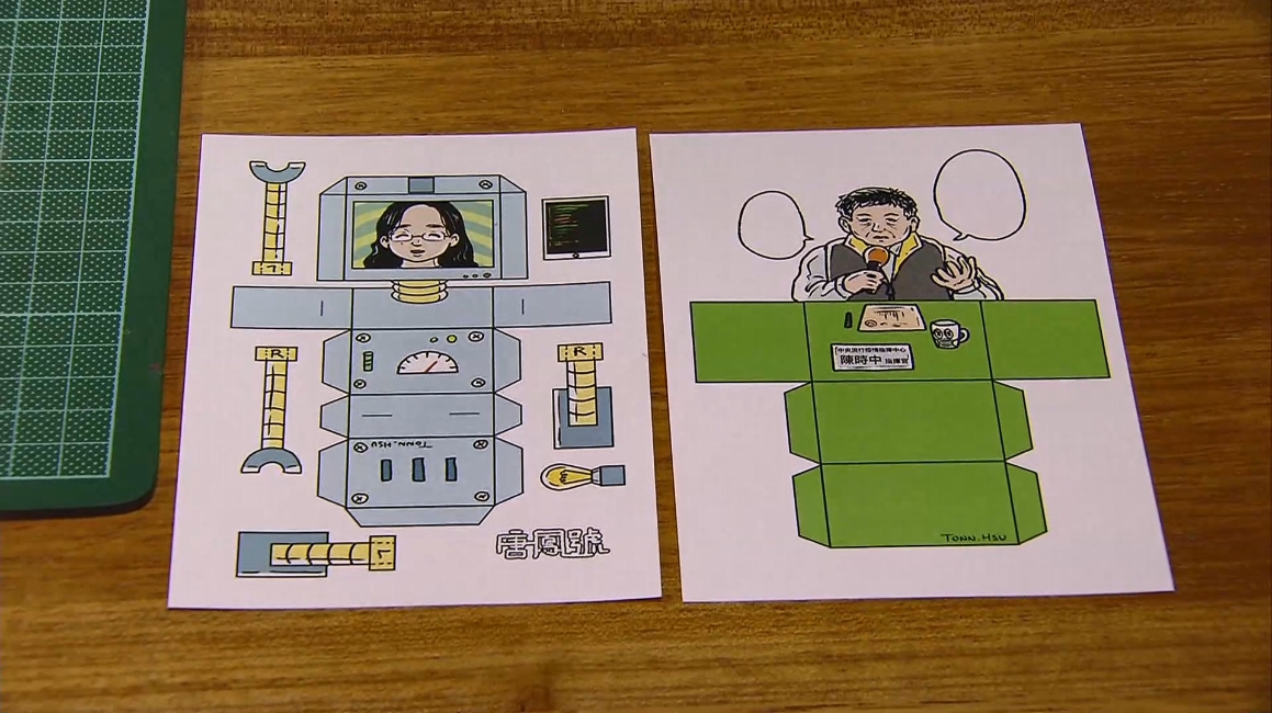 Q版阿中部長,與唐鳳機器人聯手出擊,讓民眾在疫情期間,可以在家中做紙模型,舒緩一下,為了防疫而緊繃的精神。
