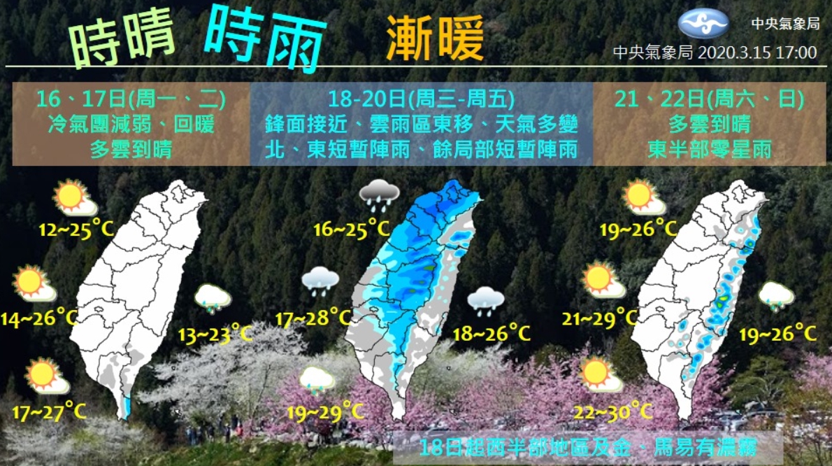 氣象局表示,因天氣回暖的緣故,18日西部、金門、馬祖等地,易有局部濃霧發生,須特別注意航班資訊及行車安全。另外,21、22日時,天氣將再度轉為多雲到晴,氣象局強調,春天天氣變化大且快,氣象預測準度較低,民眾須隨時注意最新氣象資訊,以做出適當的應對。